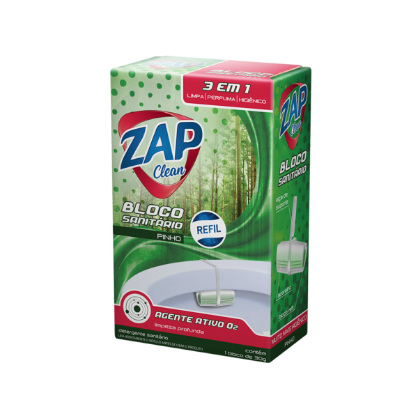 O Bloco Sanitário Zap Clean produz a cada descarga uma espuma ativa que limpa o vaso sanitário, deixando uma agradável e suave fragrância. O Bloco Sanitário Zap Clean é apresentado em higiênico aparelho com um orifício na lateral e suporte adaptável a todos os modelos de vasos e acompanha refil econômico.