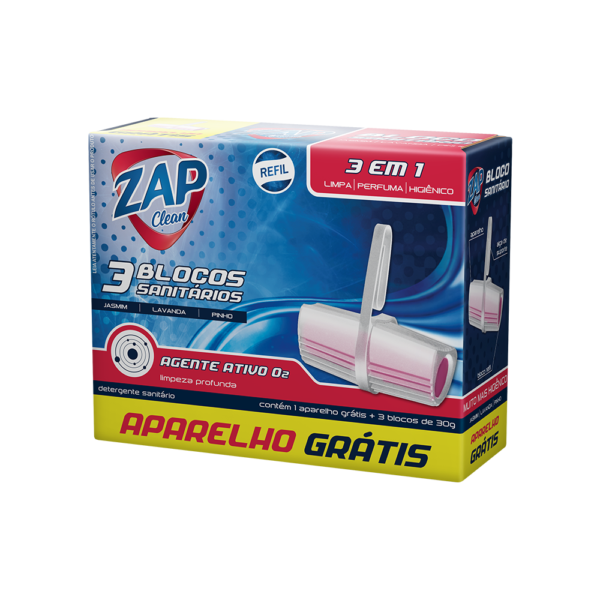 Zap Clean produz a cada descarga uma espuma ativa que limpa o vaso sanitário, deixando uma agradável e suave fragrância. O Zap Clean é apresentado em higiênico aparelho com um orifício na lateral e suporte adaptável a todos os modelos de vasos e acompanha refil econômico.