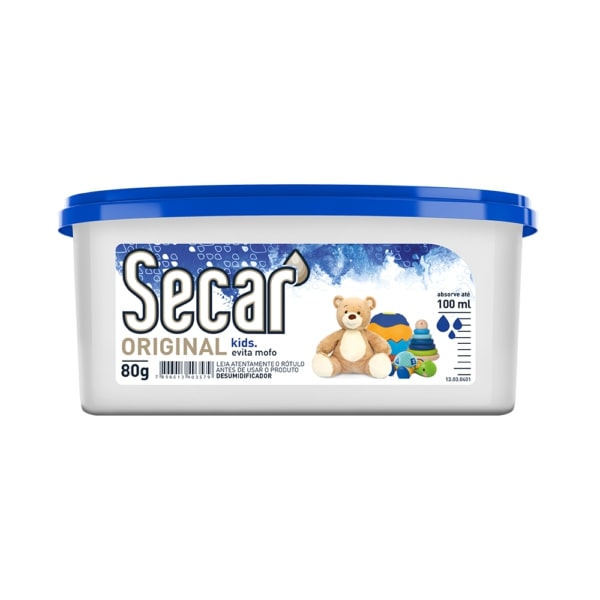 O Secar Kids é um Evita Mofo com suave e agradável perfume, que age eliminando a umidade, evitando os problemas de mofo, fungos e odor em armários, guarda-roupas, gavetas, gabinetes de pias, bibliotecas, videotecas, discotecas, pianos, aparelhos de som, equipamentos fotográficos, etc. Secar age absorvendo a umidade do ambiente, armazenando a água no pote.