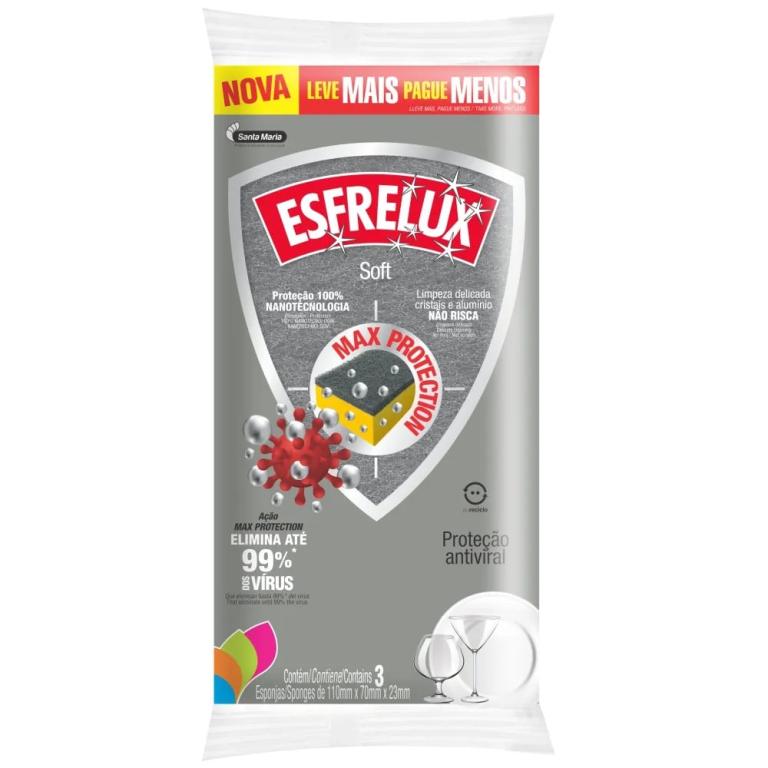 Esponja soft de limpeza delicada, para cristais e alumínio. Não risca. Possui maior poder de limpeza com a manta abrasiva mais macia. Qualidade superior, dura mais. Produto atóxico. Validade indeterminada. Composição: espuma de poliuretano e fibra sintética. 100% nanotecnologia MAX PROTECTION com íons de Prata, que elimina até 99% dos vírus. Sistema de qualidade Santa Maria. Pacote com três unidades.