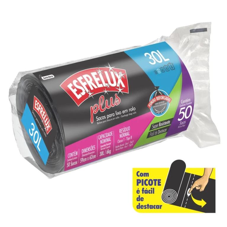 Saco Para Lixo Esfrelux Plus Com 30 Litros Em Rolo Com 50 Unidades Santa Maria. Excelente desempenho e resistência. Maior segurança nas tarefas. Na cor preta. Não tem cheiro. Uso exclusivo para lixo. Oferece descrição no conteúdo do lixo. Na versão rolo com picote e fácil de manuseio ao destacar. Comprimento (cm): 16 ., Largura (cm): 10 ., Altura (cm): 10.
