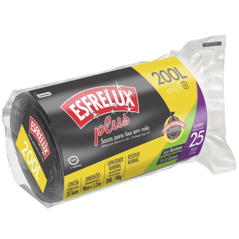Saco Para Lixo Esfrelux Plus Com 200 Litros Em Rolo Com 25 Unidades Santa Maria. Excelente desempenho e resistência. Maior segurança nas tarefas. Na cor preta. Não tem cheiro. Uso exclusivo para lixo. Oferece descrição no conteúdo do lixo. Na versão rolo com picote e fácil de manuseio ao destacar. Comprimento (cm): 24 ., Largura (cm): 10 ., Altura (cm): 8.