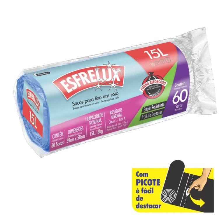 Saco Para Lixo Esfrelux Azul Com 15 Litros Em Rolo Com 60 Unidades Santa Maria. Super resistente. Cor predominante: azul. Ideal para diferenciar o lixo. Comprimento (cm): 20 ., Largura (cm): 7 ., Altura (cm): 7.