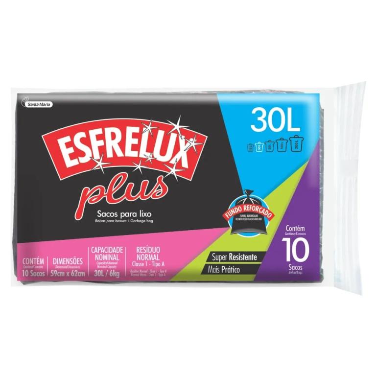 Saco Para Lixo Esfrelux Plus Com 30 Litros Em Almofada Com 10 Unidades Santa Maria. Excelente desempenho e resistência. Maior segurança nas tarefas. Na cor preta. Não tem cheiro. Uso exclusivo para lixo. Oferece descrição no conteúdo do lixo. Na versão almofada. Comprimento (cm): 26 ., Largura (cm): 17 ., Altura (cm): 20.