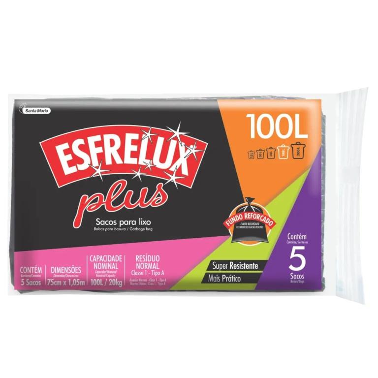 Saco Para Lixo Esfrelux Plus Com 100 Litros Em Almofada Com 5 Unidades Santa Maria. Excelente desempenho e resistência. Maior segurança nas tarefas. Na cor preta. Não tem cheiro. Uso exclusivo para lixo. Oferece descrição no conteúdo do lixo. Na versão almofada. Comprimento (cm): 30 ., Largura (cm): 18 ., Altura (cm): 15.