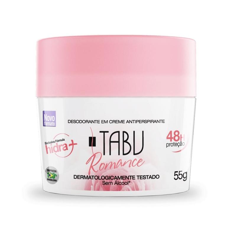 O Creme Desodorante Antiperspirante Tabu Romance possui uma fórmula especialmente desenvolvida com glicerina vegetal e óleo de girassol, que promovem a hidratação das axilas por até 24 horas.